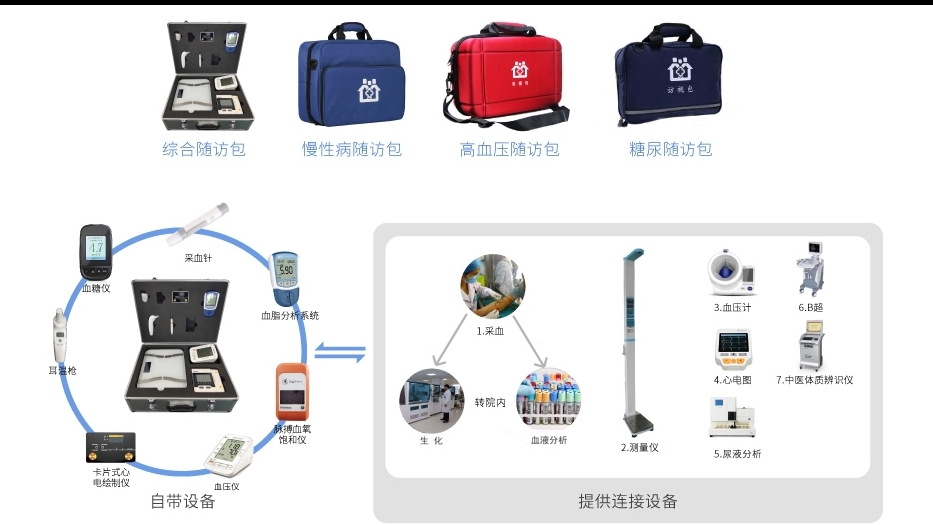 根據專科特色以及行業規范定制。所有的體檢和化驗設備輕量化,醫生無需攜帶過多設備,并且檢查項目,效率極大提高。